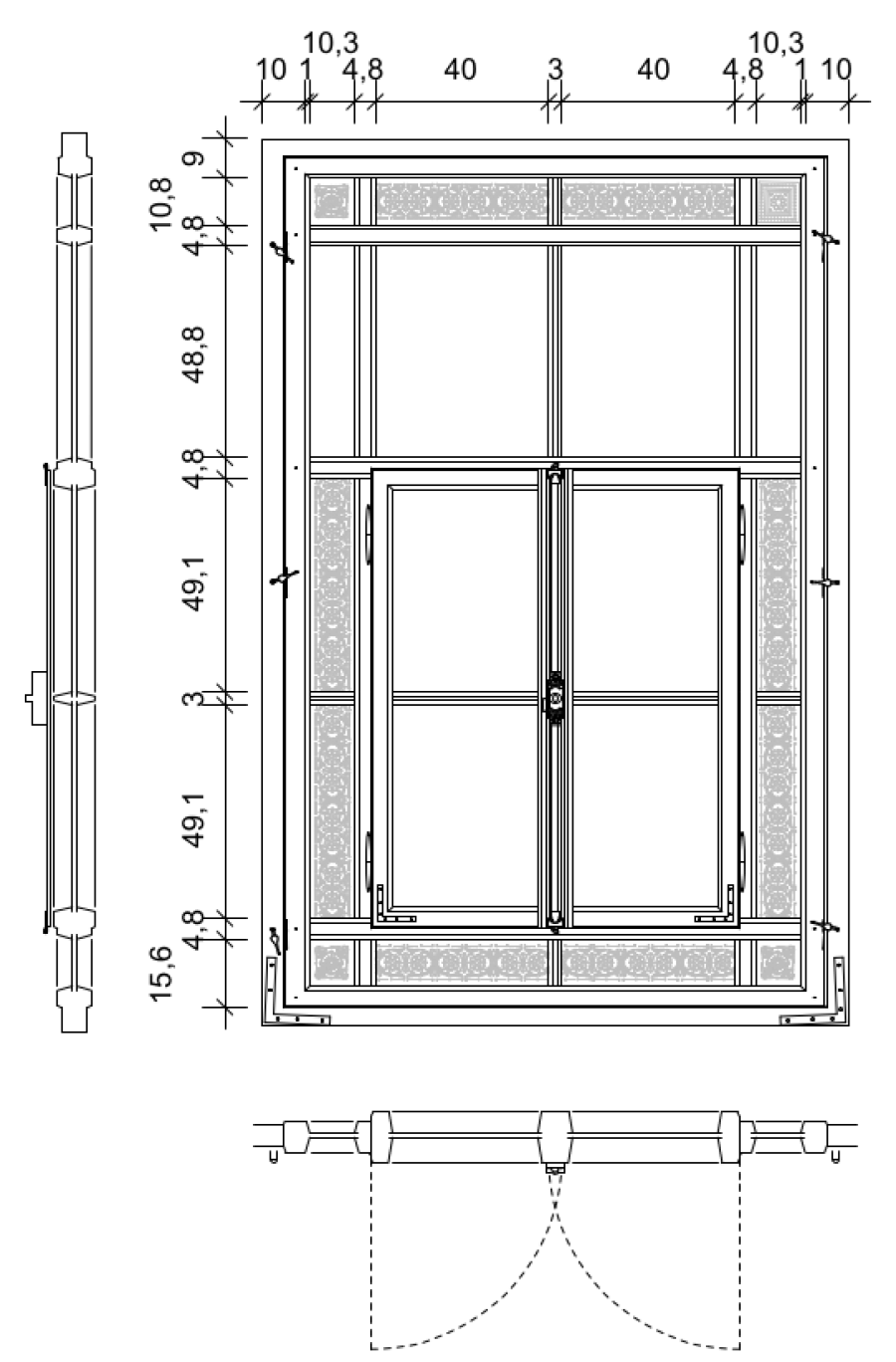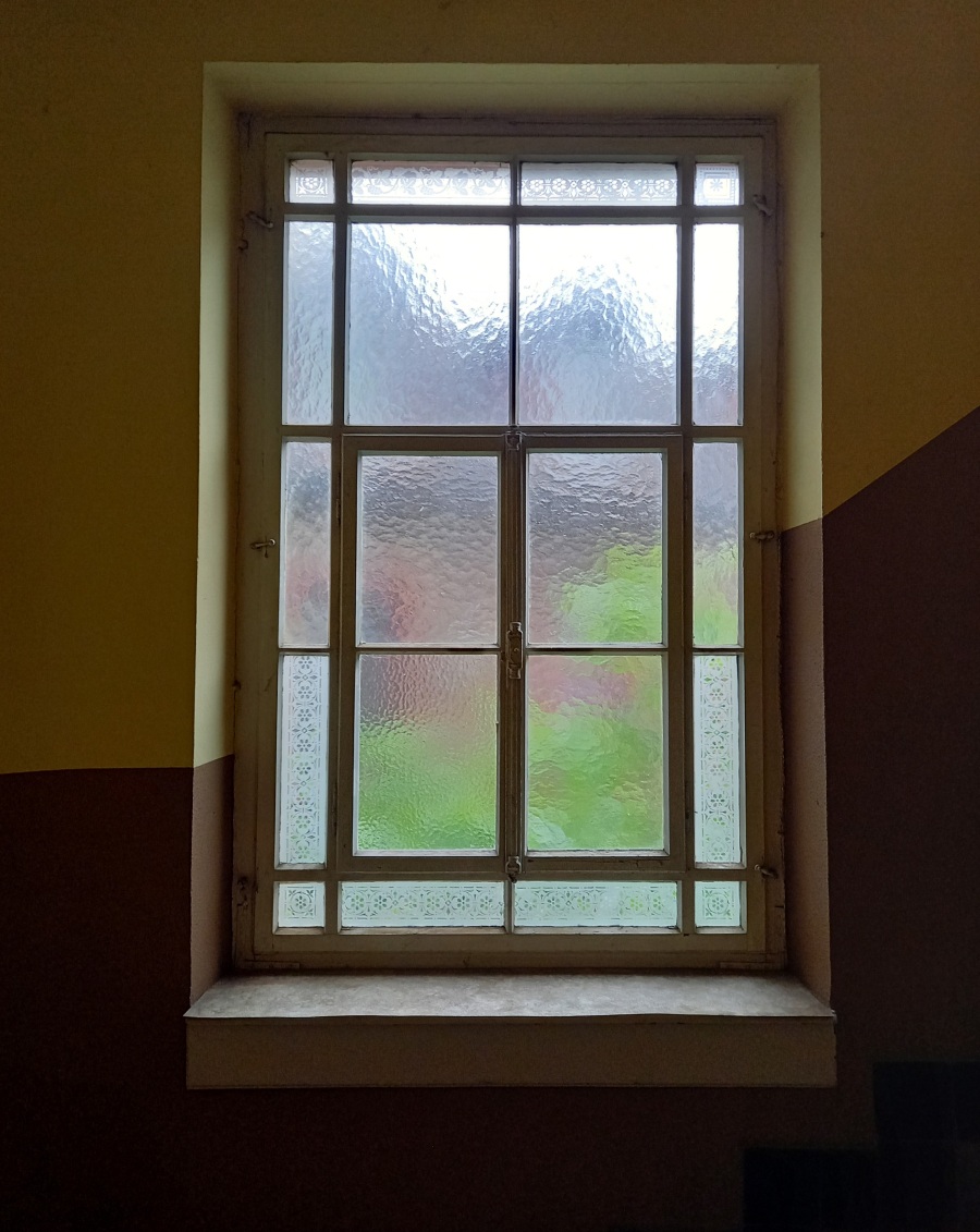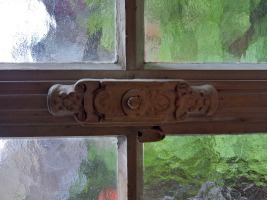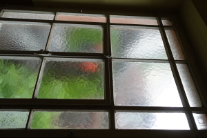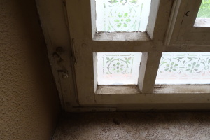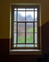 | Beschreibung | Sprossenfenster mit Einfachverglasung, grobes Ornamentglas mit zusätzlichen Verzierungen, teilweise öffenbar, Holzrahmen (weiß gestrichen), im Treppenhaus | |