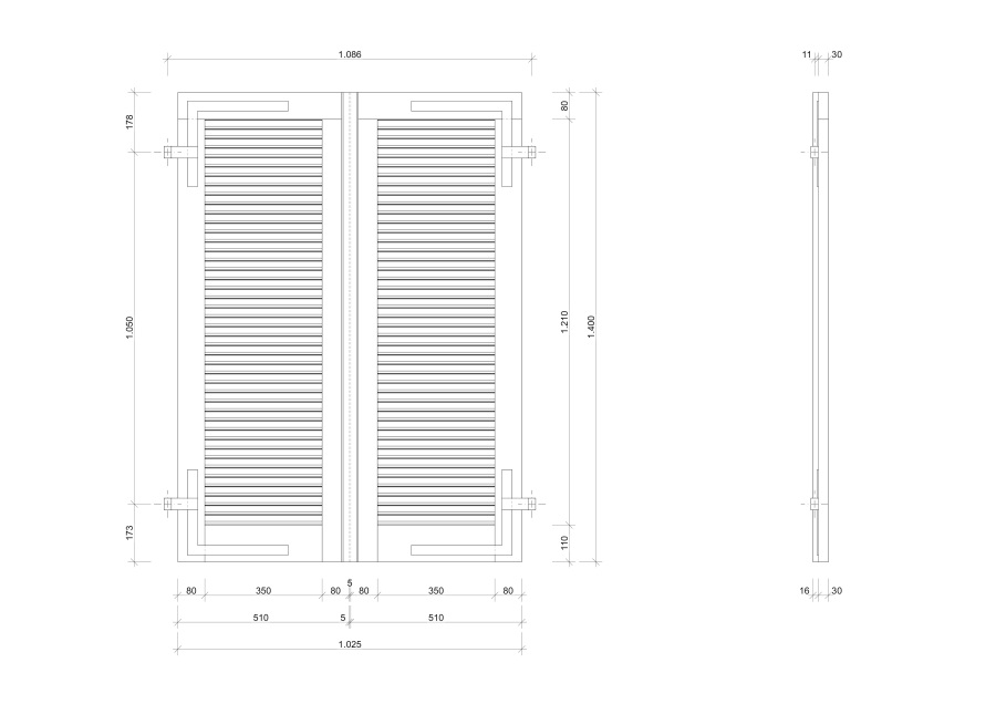 | Beschreibung | Fensterladen, Klappladen mit unbeweglichen Lamellen für eine Durchlüftung. Beschläge bestehen aus verzinktem Stahl. | |