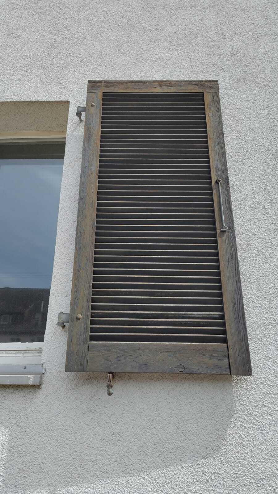 | Beschreibung | Einzelner Fensterladen aus dunkel gestrichenem Holz. | |